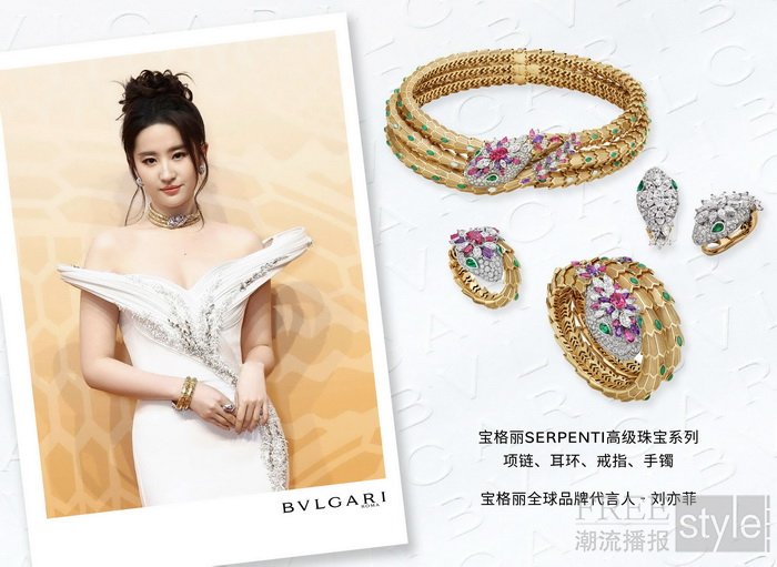开幕现场,宝格丽全球品牌代言人刘亦菲优雅演绎Serpenti高级珠宝系列花间灵蛇项链、耳环、戒指及手镯,以黄金打造的蛇身层层盘绕颈间与腕间,粉红碧玺、紫水晶和祖母绿镶嵌蛇身及蛇头,令热情大胆意式风情全然尽释,耀映渊远流长的东方格调。