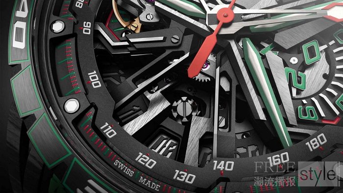 飞返功能可令计时操作迅速归零并重新启动,而垂直离合器的设计形似齿轮,协助提升精准度。创新辅助制动系统大幅减少计时秒针震动,提高运行稳定性,位于6点钟方向的导柱轮则实现流畅的启动、停止与归零动作。设于3点钟方向的红色数字120°分钟计时盘,开机瞬间即刻转动,极具动感视觉冲击。9点钟位置的倾斜摆轮为品牌标志性设计,其12°角度设计兼具抗干扰性能与立体美感。搭载钻石涂层硅质擒纵系统,带来强大抗磁效果,整枚腕表具备长达72小时的动力储备。