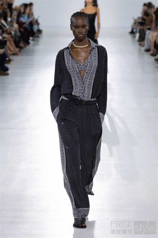 配饰同样体现了贯穿整个系列的匠心与实验精神。手袋融合编织草、竹篾、钩针织物、拉菲草、麂皮与皮革等多重元素。部分手袋缀有精美的复古刺绣;另一部分则让人联想到探险家的背包,有着地中海别墅里的靠垫那般柔软质感。蕾丝鞋底人字拖、软木坡跟鞋、流苏乐福鞋,以及漆皮或刺绣凉鞋——鞋履设计弱化了正式感,以轻盈姿态为造型注入通透灵韵。