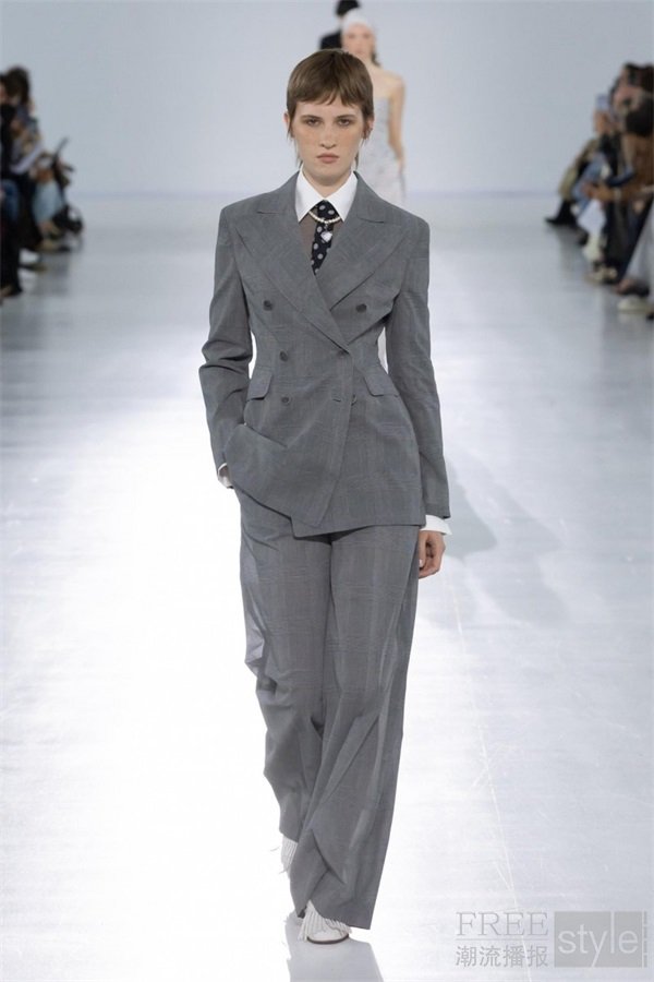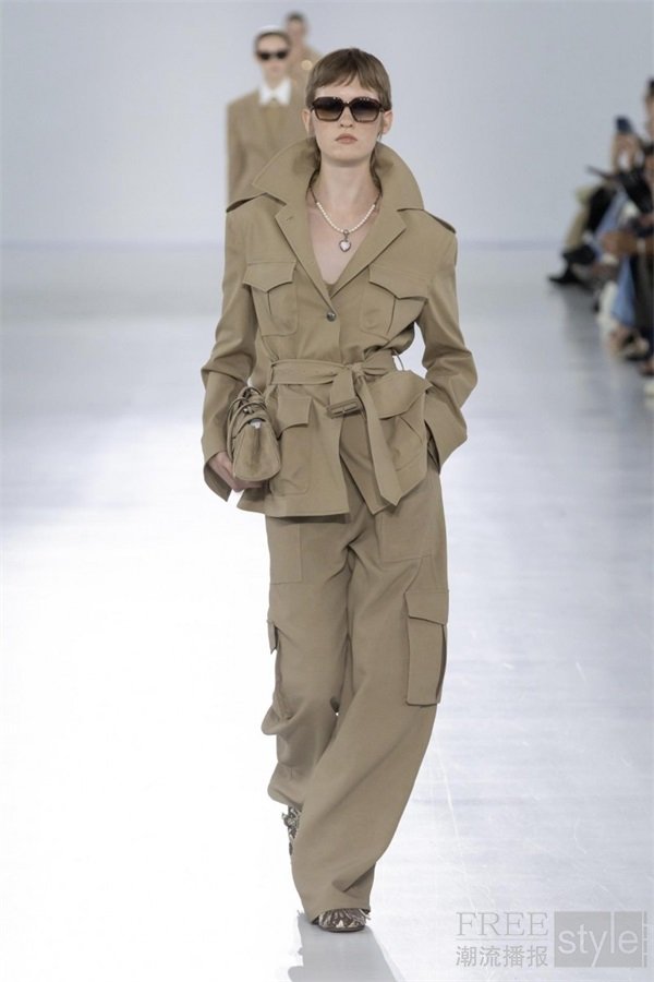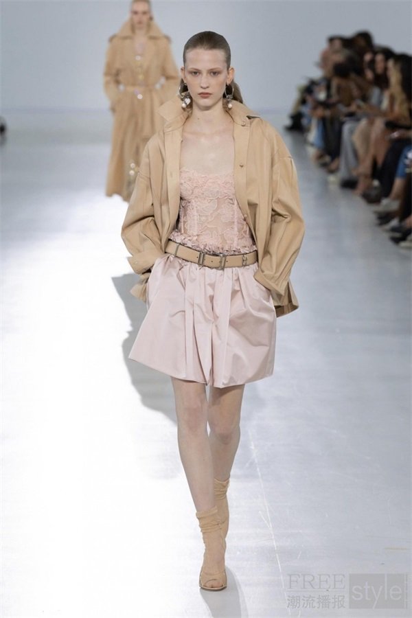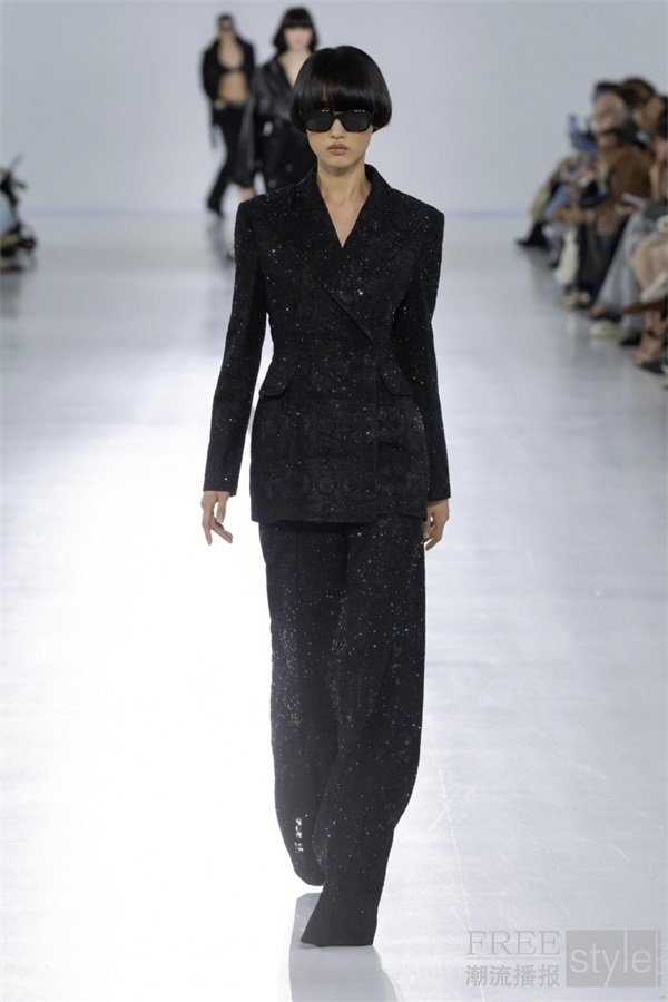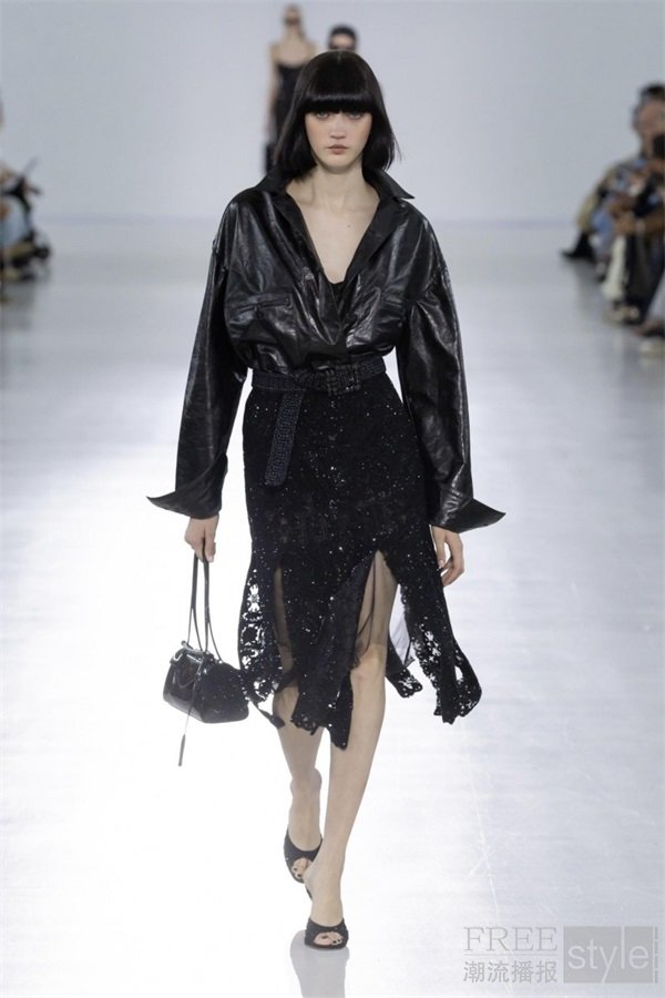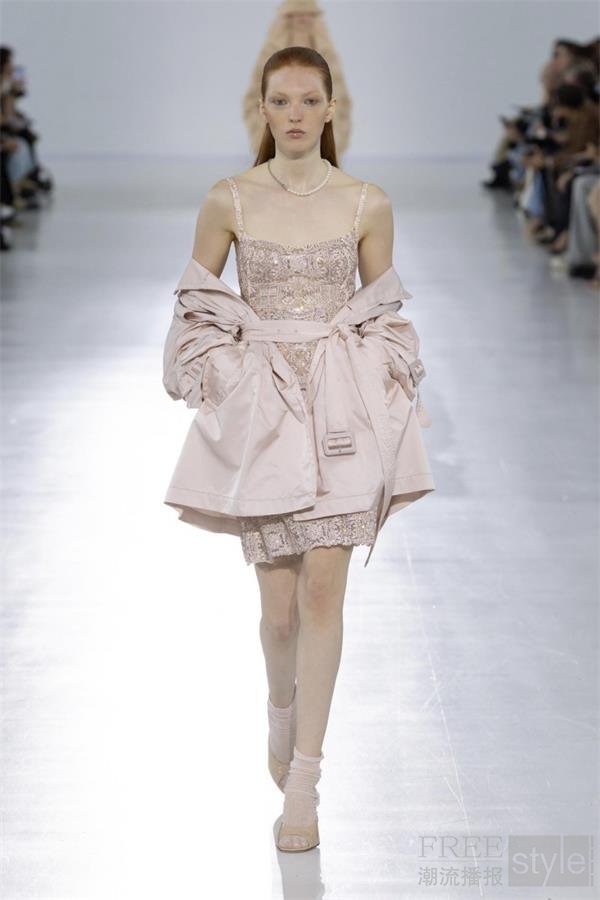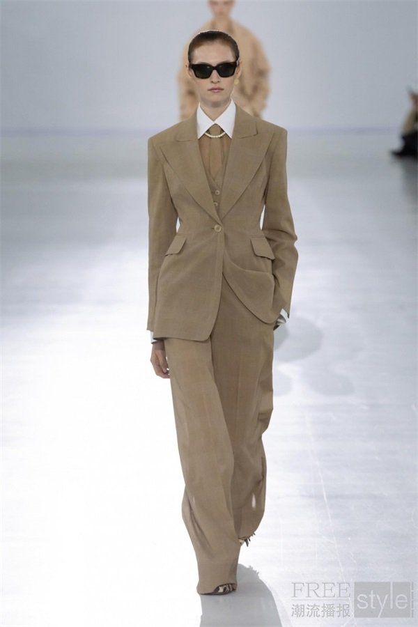 材质与面料通过工艺革新实现平衡与蜕变。经典的"鸢尾花瓣"叠层工艺,让雪纺在保持空灵通透的同时,铸造意想不到的廓形结构,它依旧是雪纺,却焕发出前所未有的新生,这甚至运用于西装剪裁之中。同样,如羽毛般轻盈的细腻纳帕皮革被压褶成不规则形态,却始终保持着原有的柔润光泽。