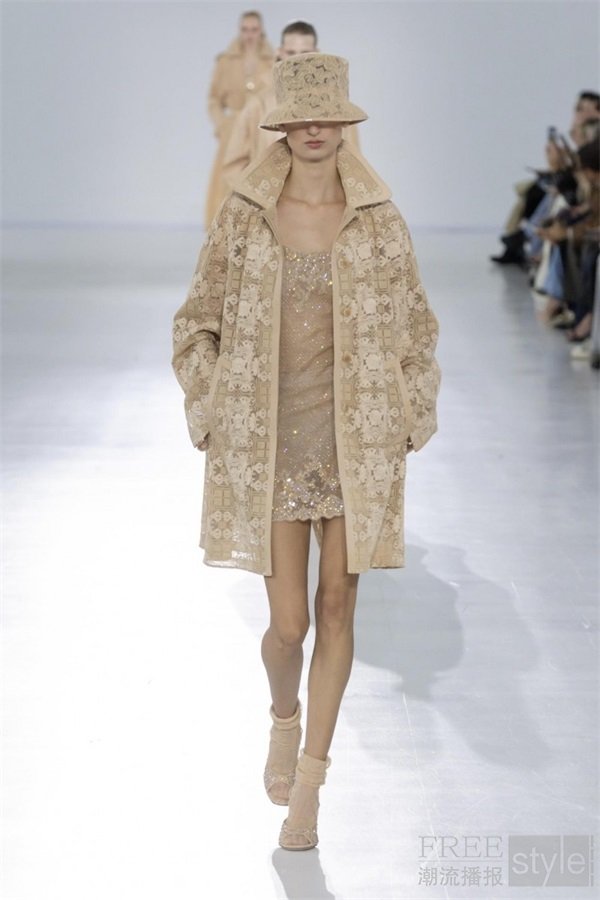 整个系列充满着极致的明暗对比,虚实同等重要,材质面料处处呼应着通透感。蕾丝与钩针编织如薄纱般轻盈流转,仿佛露台上交错的斑驳阳光。镂空剪裁、绳结纹样设计与几何排列的水晶,令人联想到莹润而不规则的陶瓷艺术品。