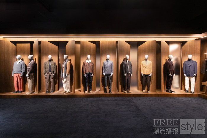 体验继续,嘉宾进入“绅装店铺”:这里既是展示区也是试穿区,复刻现代英伦裁缝店的雅致氛围。三面镜让宾客能全方位欣赏系列的精心构造与缜密设计细节。现场陈列的13套核心造型,完整呈现了该系列的风格全貌。