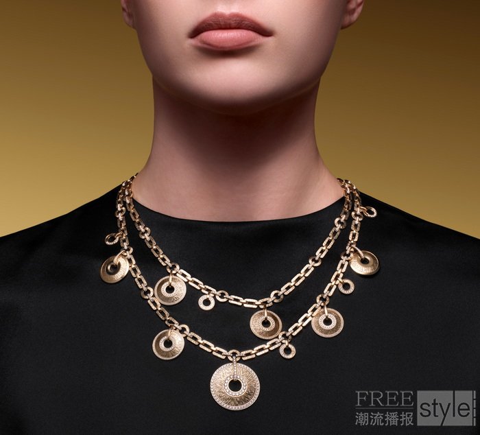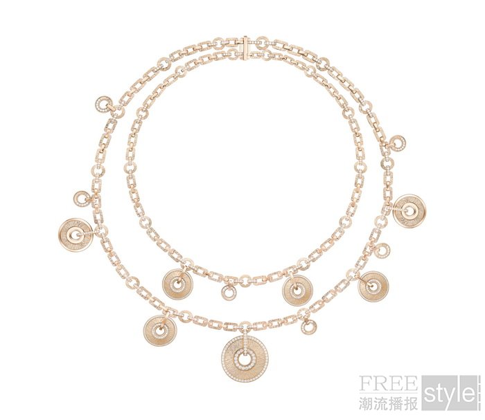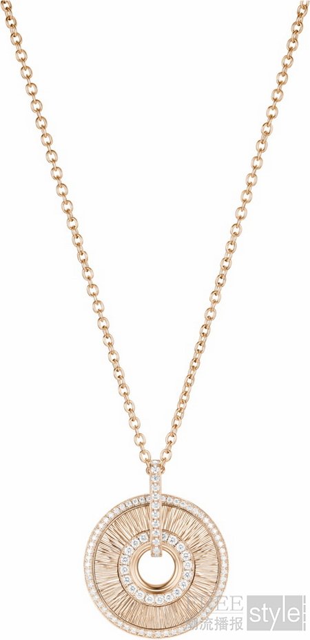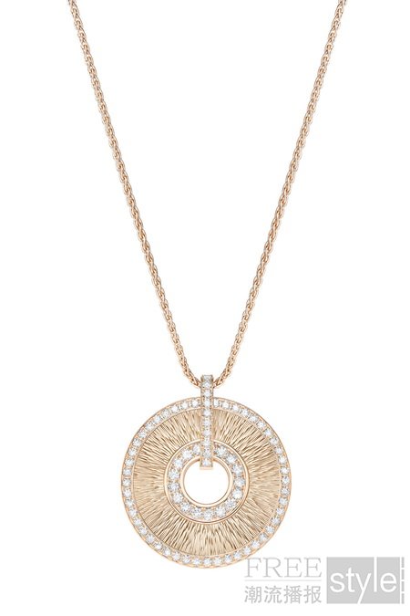 在此次新品系列中,压轴之作是一件设计大胆且富有层次的护身符项链,淋漓尽致地诠释了PIAGET伯爵“优雅亦不羁”的独特美学理念。这件作品仿佛凝聚了太阳炽热而磅礴的能量,巧妙地将8克拉钻石镶嵌于层叠交织的圆形装饰组合中,流转生辉。多元形态与精美链节交织辉映,每一处细节皆由匠心巧手精雕细琢,不仅令佩戴者光彩照人,更传递出欢欣愉悦与蓬勃活力。