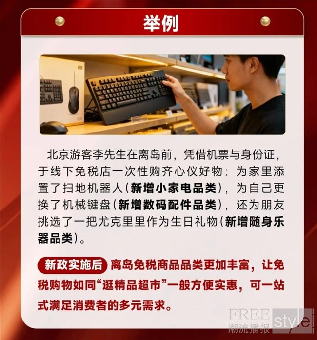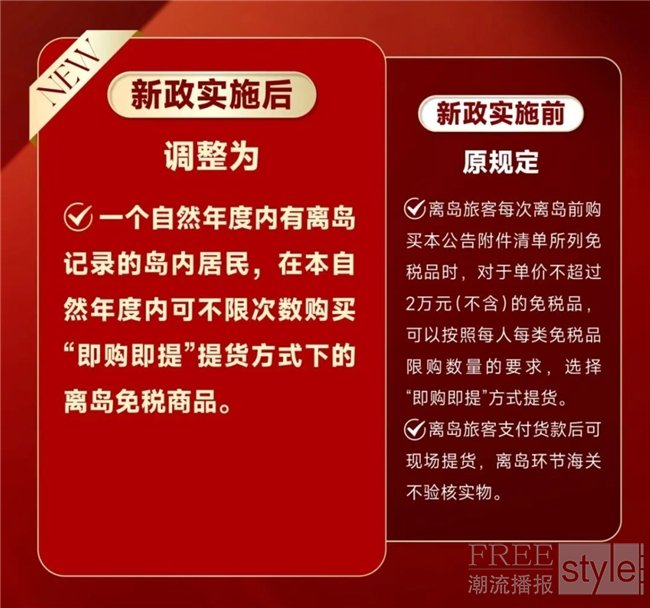 不仅如此,为进一步提升岛内居民日常生活购物便利度,本次政策调整还放宽了其购买离岛免税商品的条件,针对在一个自然年度内有离岛记录的岛内居民,在本自然年度内可不限次数购买包括化妆品、香水、服装服饰、箱包等15类“即购即提”离岛免税商品。