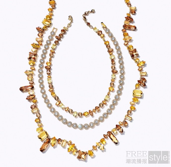 Millenia系列以宝石珠串廓形致敬施华洛世奇的先锋传奇,本季新添温暖浓郁的焦糖色,与紫色搭配出独特的秋日韵味。系列采用阿斯切切割、长阶梯形切割及八角形切割工艺,结合双爪镶与不对称设计,展现如河流般流动的光影效果,优雅而富有层次,成为秋季日常搭配的点睛之笔。