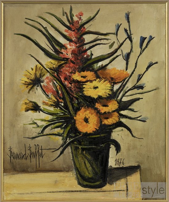 法国现代艺术大师贝尔纳∙布菲(Bernard Buffet)以其标志性的冷峻风格,成为战后欧洲焦虑与粗野主义美学的深刻写照。他的画作常萦绕着一丝孤寂与不安,却在压抑中透露出不容忽视的精致感。此次展出的《瓶中金盏花束III》正是典范:布菲以经典的中性色调为背景,勾勒一瓶盛放的金盏花。花瓶置于简朴的木桌之上,愈发反衬出花朵的浓烈色彩,形成极具冲击力的视觉对比。艺术家通过凝练的线条与强烈的结构感,赋予静物以戏剧性的内在张力,展现出其驾驭形式与情感的非凡能力。