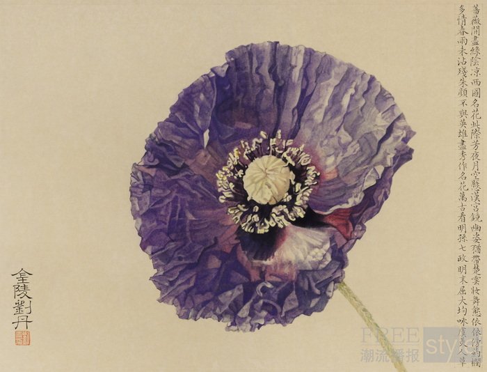 在《虞美人· 紫》中,刘丹让观众聚焦于虞美人草。他并非简单地描摹花朵,而是在为明代诗人孙七政、屈大均的咏叹作注。画中的虞美人,或许正带着“楚云妆”的幽姿,在“汉宫镜”般的月下静静起舞。艺术家用笔墨接续了古人的情怀,将“朱颜不与英雄尽”的诗句,转化为可观的、永恒的图像——英雄虽已逝去,但名花的风采与诗人的赞颂,却能在艺术中得以永存,供我们万世欣赏。