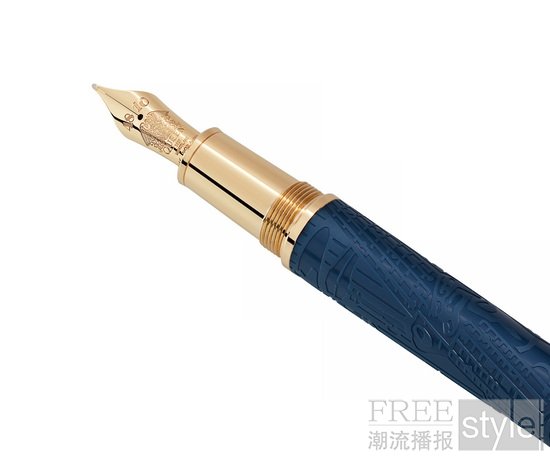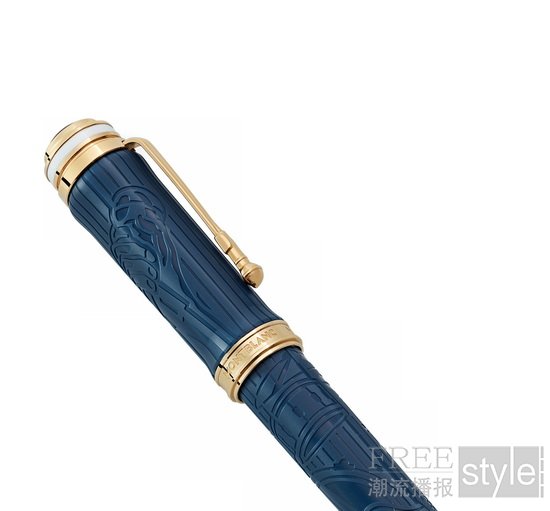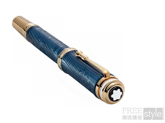万宝龙著名人物系列致敬皇后乐队特别款书写工具的设计灵感源自皇后乐队备受赞誉的专辑《二十年金曲精选》(Greatest Hits II)。作品采用深邃的蓝色名贵树脂打造,搭配镀金饰件,巧妙呼应双黑胶唱片鲜明的蓝金配色封面。笔帽与笔杆上分别镌刻着四位乐队成员的代表乐器图案:笔帽刻有摩克瑞的麦克风与迪肯的贝斯图案,笔杆则刻有梅的吉他与泰勒的架子鼓图案。笔夹复刻了演唱会上带支架的麦克风造型,以此致敬摩克瑞极具感染力的台风;笔帽顶端的设计灵感则源于摩克瑞在演唱会压轴曲目《天佑女王》(God Save the Queen)表演时佩戴的经典皇冠造型。