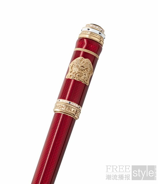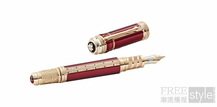作为该系列的压轴之作,万宝龙著名人物系列致敬皇后乐队限量款书写工具(全球8支)向皇后乐队极具戏剧张力的舞台风格致敬,并特别纪念主唱佛莱迪·摩克瑞在乐队原始阵容的最后一次大型巡演“Magic Tour”中身着的标志性“皇家斗篷”,这套传奇演出服的设计灵感源自拿破仑加冕礼袍。书写工具的笔帽与笔杆采用18K金打造,饰有精致的玑镂花纹,并覆以半透明胭脂红漆,营造华丽质感。斗篷上华贵的白貂毛边经大师工坊工匠巧手演绎,化作笔身上精心密镶的明亮式切割钻石与深蓝色蓝宝石;同样源于斗篷的鸢尾花(fleur-de-lys)十字装饰纹样不仅点缀于笔杆之上,亦装饰于18K黄金笔杆尾端,与吉他琴弦般的线条装饰图案巧妙融合,宛如指尖跃动的音乐灵韵。笔杆底部镶嵌一颗红色石榴石,增添瑰丽氛围。皇后乐队的标志性徽章在笔帽上以精细雕琢的18K金立体浮雕形式呈现,与红色半透明漆身形成鲜明对比,尽显尊贵气度。此外,书写工具前端环绕的纹饰设计,灵感源自诸多正式场合中不可或缺的皇室绶带,进一步呼应皇后乐队的王者台风与影响力。