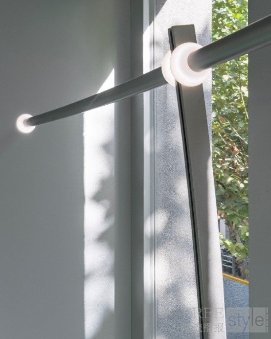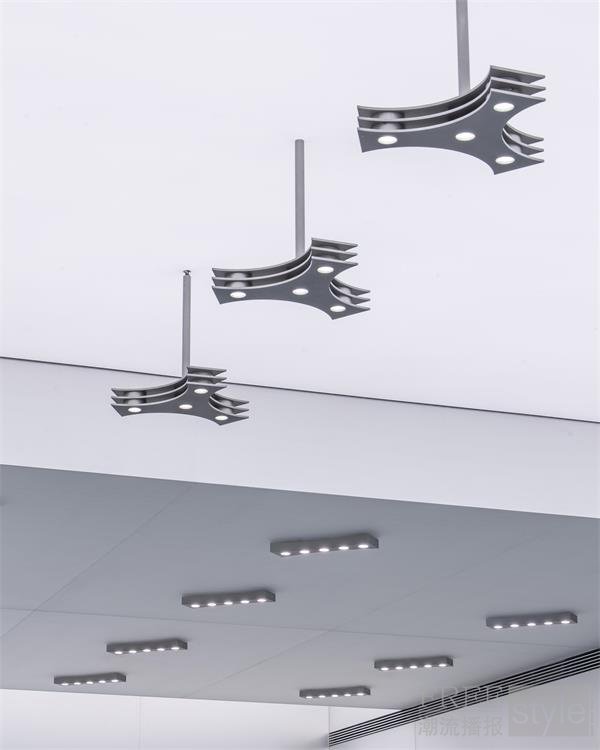 空间中央的挂架与桌体以直线与曲线交错的结构打造,在几何的张力之中形成柔和而有韵律的节奏感。天花板采用 Barrisol(巴里索)灯光系统,最大化光线的扩散效果;墙面则以缎面磨砂玻璃收边,通过细腻的反射与通透感,视觉化地呈现出 <The Bits: Light and Dark> 所蕴含的“光与暗共存”的概念。尤为引人注目的是,天花处的金属灯饰以点阵图案(Dot Pattern)制成,呼应了空间的叙事主题——以光线化作点的形式散射与连接,直观地表达了能量流动与信息交织的过程。