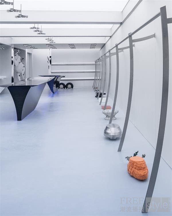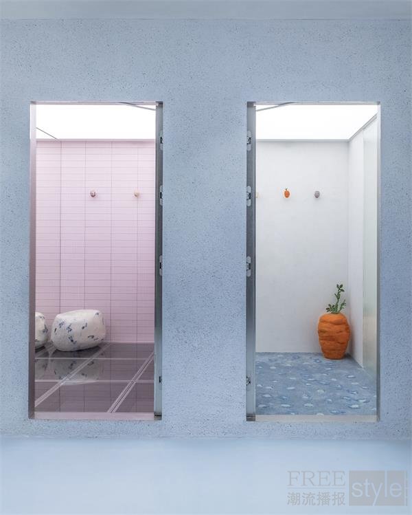 在 ADERERROR Shanghai Space 中,共设有四间试衣间,分布于一层与二层。一层的试衣间以 斑点狗造型装置与胡萝卜造型凳(Carrot Stool) 增添趣味与幽默感;而其他试衣间则通过不同的材质组合与结构细节,进一步拓展了品牌体验的多样性与层次感。
