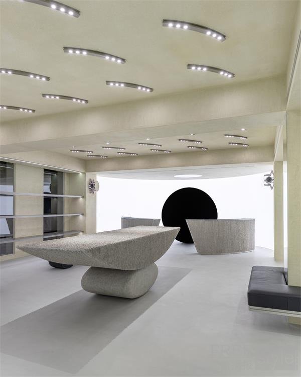 展示 ADERERROR 主系列的一层空间以品牌独有的美学理念——“后极简主义(Post Minimal)” 为核心,通过直线与曲线的组合,以及多种材质之间的平衡与融合,呈现出极具创新性的空间设计。