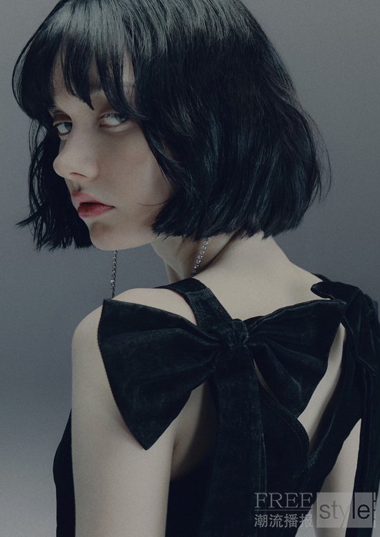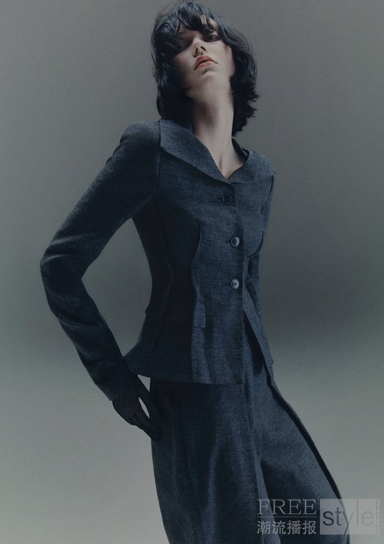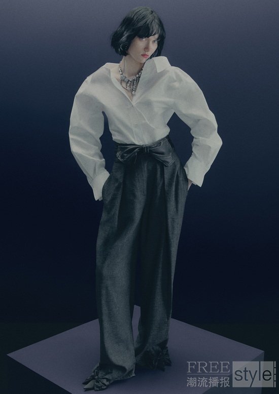 衬衫设计亦别具新意,经典白色礼服衬衫以宽敞领口与落肩设计重新定义女性力量;高领荷叶边衬衫则融合褶饰胸襟与深袖口细节,为造型增添层次感。外套延续品牌的廓形表达,棕黑格纹呢大衣以柔和线条和独立围巾设计,营造温暖包裹感;短款水洗皮夹克以风衣结构重塑比例,恰如节日夜色间的一抹冷冽锋芒。配饰部分,缎面蝴蝶结细高跟鞋与宽靴筒皮靴勾勒利落线条;荷叶边蕾丝手套、多层项链与水洗丝绒贝雷帽为整体造型增添戏剧韵味,呼应本季系列自由与浪漫的精神气息。