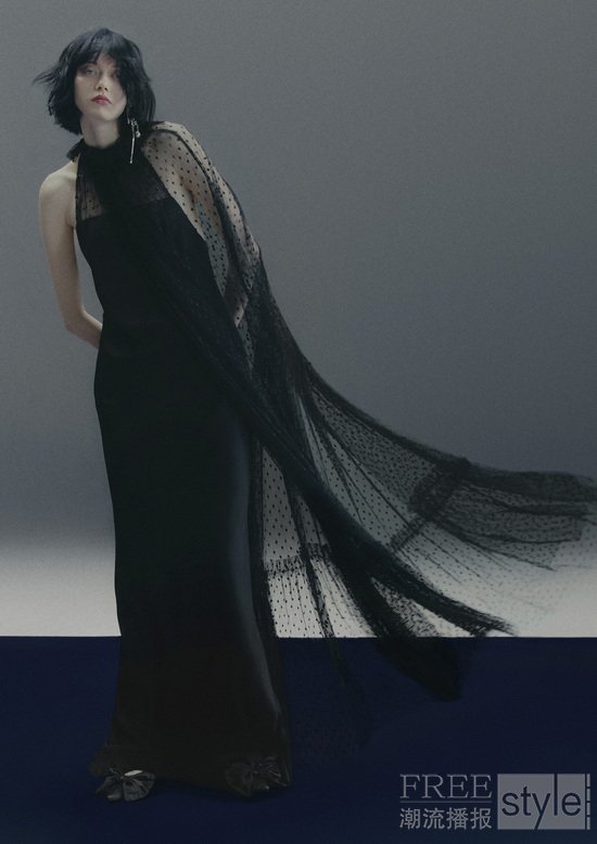 本季系列色调以黑色、深巧克力棕、酒红、米白为主,加以亮黄点缀,在低调中蕴藏张力,衬托出浓郁的节庆氛围。材质搭配上亦展现出丰富层次,从轻盈塔夫绸到透感亮片网纱与厚棉提花,皆在光影流转间呈现独特质感。剪裁挺阔的黑色短版西装外套搭配高腰长裤,散发干练气场;黑色波点网纱斗篷叠穿于垂坠无袖礼服之上,以高领荷叶边与层叠下摆打造戏剧氛围;米色亮片束身礼服加以华美褶饰雕塑身形,点燃节日夜晚的璀璨瞬间。