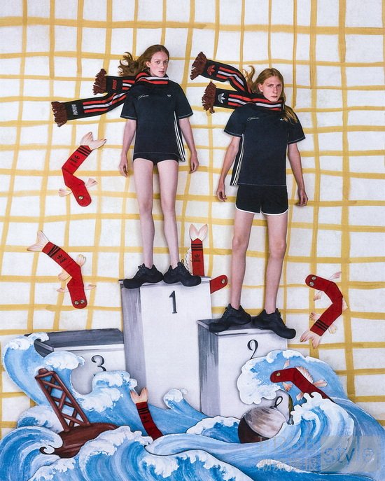 系列的广告大片由匈牙利摄影师 Szilveszter Mako 掌镜,他以融合原始身体力量与超现实视觉构图而闻名。本次拍摄延续了合作系列的讽刺与玩味精神——“如果 adidas 代表运动员,那么 adidas Originals by Avavav 系列就是为其他的所有人打造。” Mako 通过用“游戏”取代“竞技”的方式诠释这一理念,将系列置于充满奇趣的场景中,凸显其古怪而特别的视觉魅力。