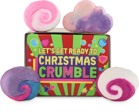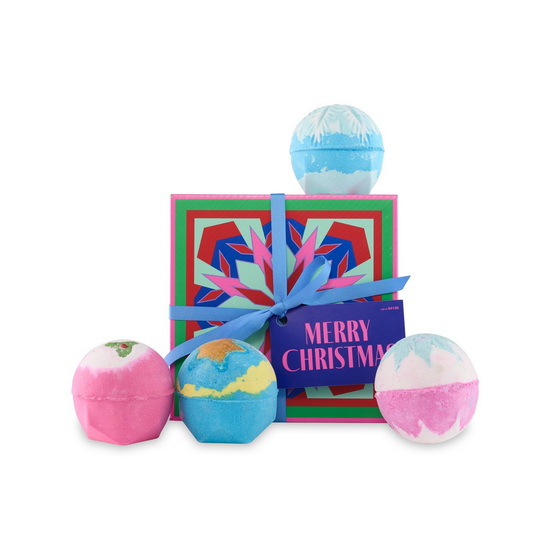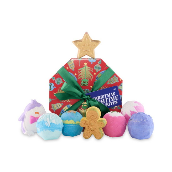 礼盒内容: 圣诞老人汽泡弹、驯鹿宝贝汽泡弹、姜饼人汽泡弹、节日糖果泡泡浴芭