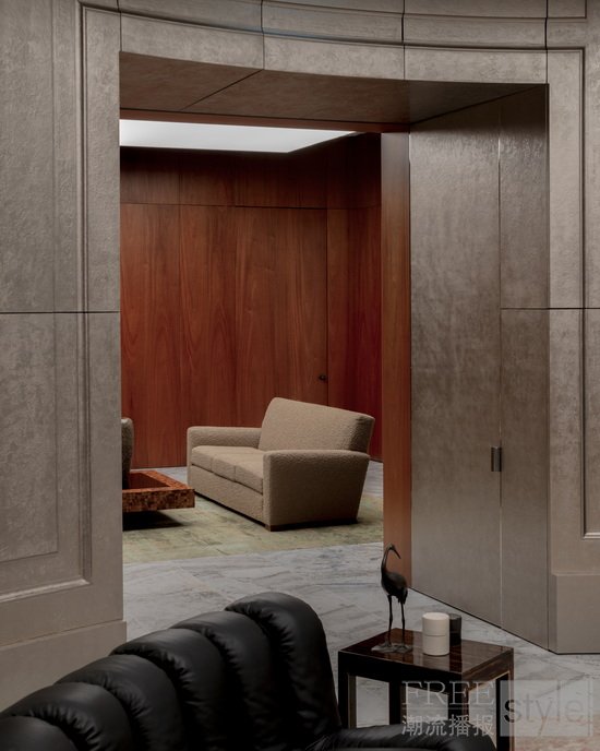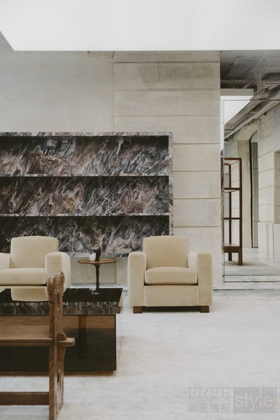 空间内精心甄选的家具与艺术品植根于圣罗兰的文化传承。典藏之作包括Süe & Mare的对椅、Paul Poiret为 Martine 工坊设计的躺椅、François-Xavier Lalanne 设计的茶几,以及 Jean-Michel Frank、Charlotte Perriand 与 Josef Hoffmann这些传奇大师的多款杰作——与圣罗兰先生的收藏家精神遥相呼应。