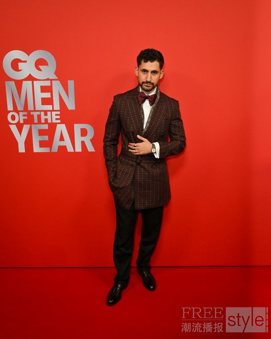 英籍埃及演员Amir El-Masry(埃米尔·艾尔-马斯里)身着dunhill 2025秋冬系列,勃艮第红羊毛印花Bourdon双排扣戗驳领晚礼服大衣,搭配白色晚宴衬衫,黑色羊毛晚装长裤,流苏晚装围巾,羊毛罗缎领结,丝绸口袋方巾以及黑色流苏乐福鞋,亮相GQ年度盛典。