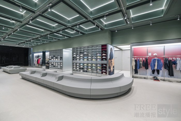门店设计从天河公园跑步路线中汲取灵感,将自然意象转化为设计语言:天花以现代藻井结构模拟林荫大道的指引,灯光下的金属格栅映出粼粼波光,灰绿与陶土色调则呼应着沿途树影与土壤。整个空间借材质、色彩与光影的协同,让跑步的节奏与呼吸感自然流露。