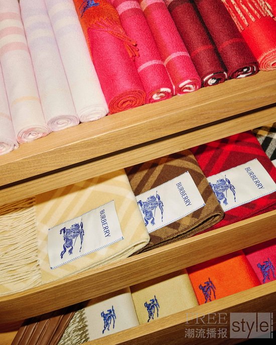 精品店设有围巾艺术创意专区,优雅展陈Burberry 软配饰之作,生动诠释标志性英伦设计背后的匠心与传承。围巾系列涵盖柔软羊绒和丝质斜纹等多样材质,通过丰富色调、图案和纹理构筑美学盛宴,亦有缤纷Burberry 格纹配色静候品鉴。