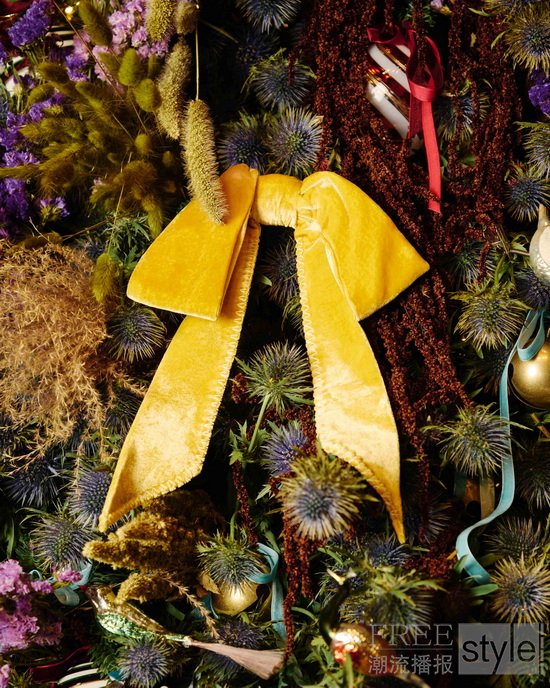 16英尺高的传统圣诞树装点精美蝴蝶结,每一枚皆由Burberry 富余面料制成,承载维多利亚时代的“团结”寓意。树身点缀野生枝叶和苏格兰国花蓟花,呼应Burberry 与苏格兰高地的悠久渊源,亦致敬品牌羊绒围巾产地。来自自然的色彩与触感巧妙融合,将英伦户外风光尽展于此。