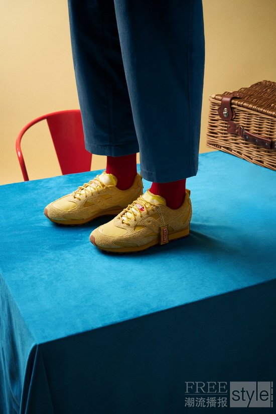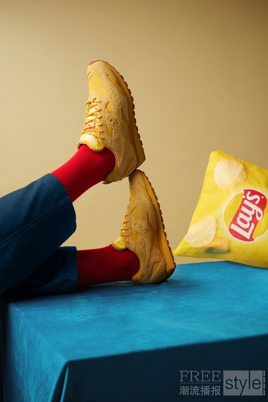 Trainer 80X 联名鞋款以乐事原味薯片标志性的亮黄色为主色调,唤醒大众对经典风味的情怀。材质上,鞋身采用细腻麂皮与质感皮面拼接,兼顾复古质感与日常耐用性,触感层次丰富;鞋舌选用杜邦纸材质,设计成锯齿状可撕拉的创意形态,模拟薯片包装开口的仪式感,撕开后露出带有乐事 Logo 的皮面鞋舌,为穿搭增添互动趣味;鞋侧还点缀迷你袋装薯片造型挂件,正反面印有双方品牌 Logo,小巧精致且不失辨识度。