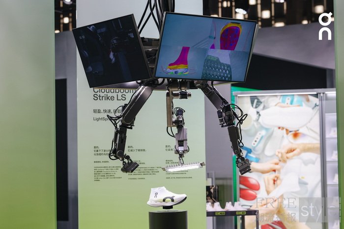 展台体验动线引导现场参与者深入了解LightSpray™鞋面科技与Cloudboom Strike LS的真实表现。LightSpray™科技展示以图像演示形式,直观呈现由 On 昂跑自主研发的机械臂如何在3分钟完成仅重30克的跑鞋鞋面喷织,整鞋仅有7个零部件构成,轻量、无缝,颠覆行业。