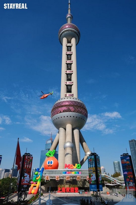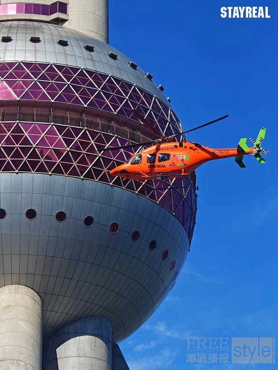 印有STAYREAL「MOJO HAPPY WORLD」专属皮肤的直升机盘旋于东方明珠前