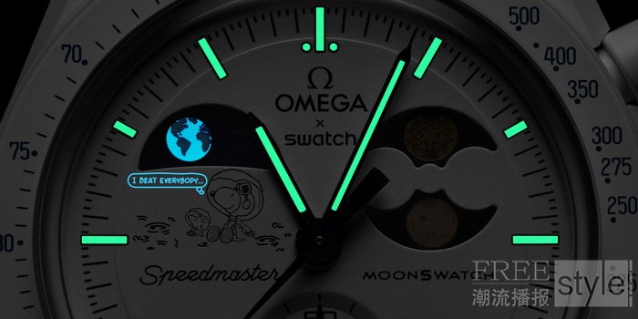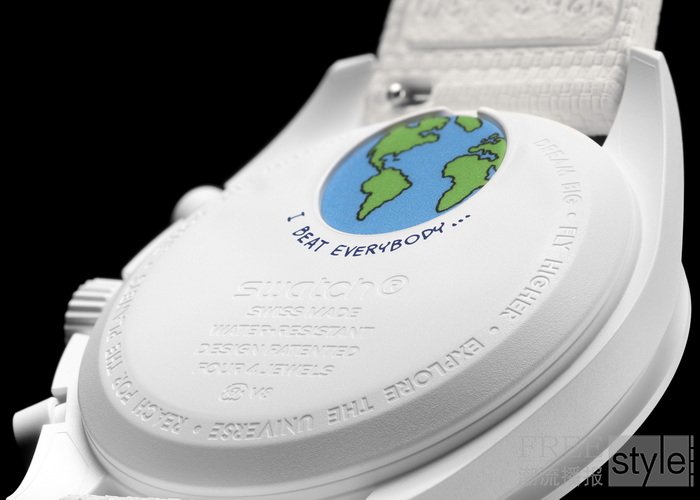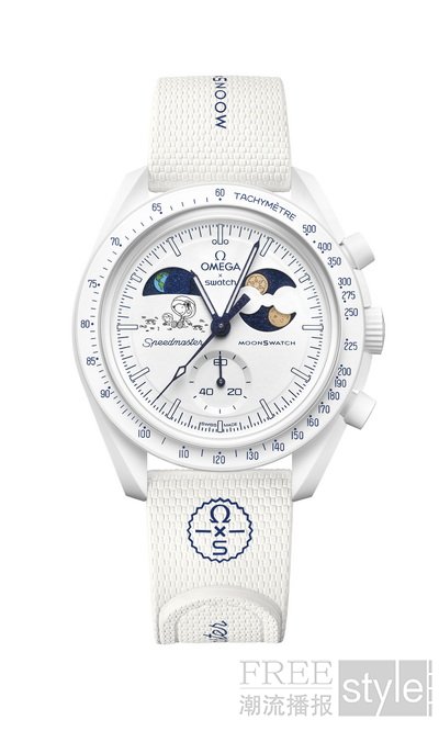 表盘:月光白色表盘,饰以 OMEGA X Swatch、Speedmaster 和 MoonSwatch 标志;内嵌小表盘和时标覆以 A 级 Super-LumiNova(绿光)涂层。月相指示器搭配闪亮深蓝色月相盘,并饰以两轮覆以欧米茄Moonshine 18K金(Moonshine Gold)涂层的满月。及采用 UV 墨水(蓝光)绘制的隐藏细节。地相指示器上的地球以星辰点缀的背景为衬托,地球上的海洋采用 UV 墨水(蓝光)绘制海洋。