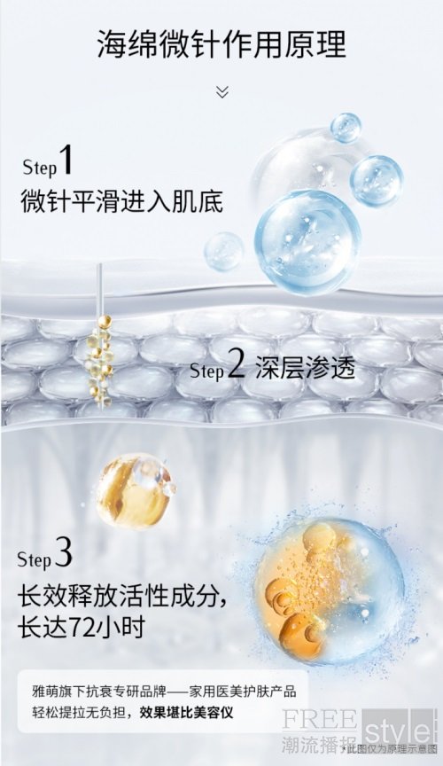 该项技术的灵感源于海洋生物科技,从天然海绵中萃取微针成分。这些微米级的“海绵微针”能够温和地穿透皮肤角质层,构建起一条条直达肌底的微观通道,从而将高浓度的活性成分精准输送至目标位置。更值得一提的是,为确保安全无残留,这些微针成分会在约72小时后随肌肤的自然代谢过程完全排出。此项技术凝聚了雅萌集团以往丰富的研发经验及成果,展现了其强大深厚的研发底蕴。