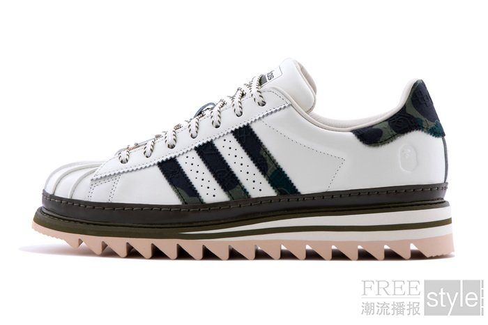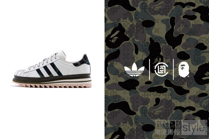 经过重塑构想的SUPERSTAR三方联名鞋款延续了标志性的贝壳鞋头,陈冠希将经典轮廓转化为前卫设计,无缝融入BAPE®与CLOT两大品牌的美学精髓与格调。鞋身采用米白色优质皮革打造,饰以精细缝制脊纹与橄榄绿工装元素,增添实用且丰富的层次感。BAPE® 1ST CAMO经典迷彩与CLOT丝绸图案交织融于三条纹、STA徽标及后跟等细节之处,营造出强烈的视觉张力。独特的沙色锯齿波浪纹大底,则彻底颠覆了SUPERSTAR的传统轮廓。低调的BAPE®与CLOT压印标识平添精致韵味,而印有「CLOT」与「BAPE®」字样的金属鞋带扣更为鞋款注入收藏级的匠心细节。
