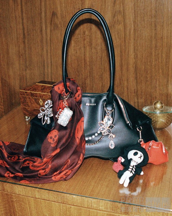 Manta手袋,重塑自2010春夏系列问世的McQueen De Manta。采用柔软且富有立体感的皮革,塑造出棱角分明的折叠廓形。并可搭配以麦昆标志性角色为灵感的个性手袋挂饰。