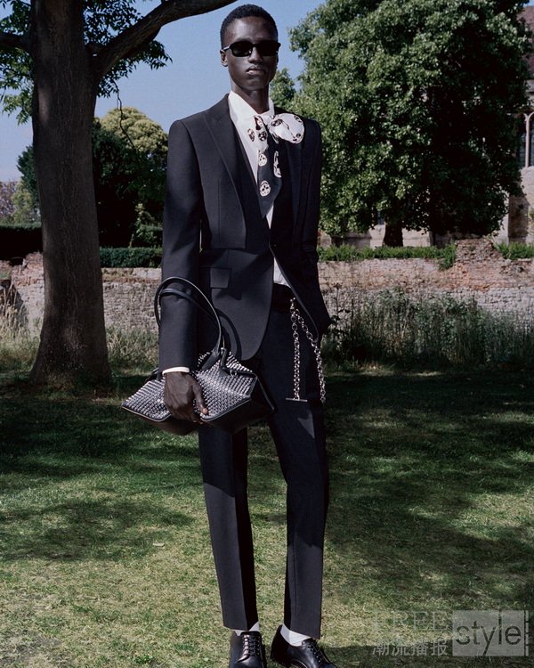 Dafydd Jones 摄影作品《The Last Hurrah》中的派对图景于此重现。反叛与浪漫主义的张力暗流涌动。水晶吊灯碎片刺绣点缀于黑色丝绸之上,西装廓形利落而修身。抛光的金属T-Bar饰件与黑色精裁礼服形成风格碰撞,承袭自萨维尔街的精准剪裁工艺。