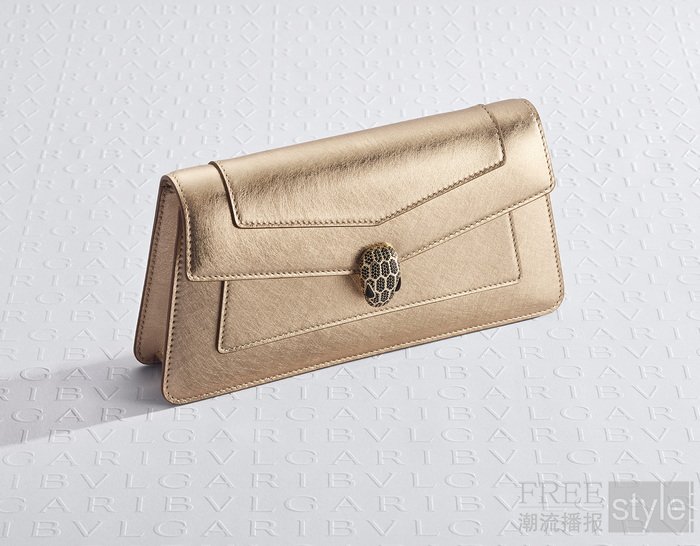 作为宝格丽Serpenti系列晚宴包的全新力作,Serpenti Forever晚宴手拿包选用金色条纹小牛皮,巧妙融合了精致美感与实用功能。蛇首搭扣镶嵌黑色锆石,并以缟玛瑙点缀双眸,散发迷人魅力。所有新款晚宴手拿包将于2026年5月起正式发售。