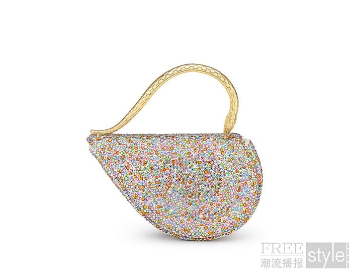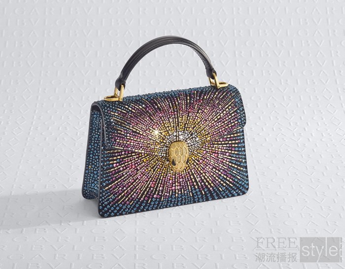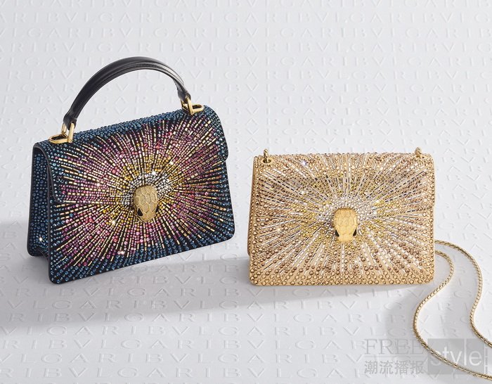 在本季皮具与配饰系列中,“烟火水晶”(Fireworks Crystals)工艺大放异彩,为宝格丽Serpenti Forever系列的两款标志性单品增添了熠熠华彩。其中,经典的Serpenti Forever Top Handle手提包精心镶嵌了8,348颗水晶,而日夜皆宜的Serpenti Forever包袋则点缀9,581颗水晶,绽放璀璨光辉。这两款作品从宝格丽烟火高级珠宝腕表中汲取设计灵感,并推出多色渐变款和金色款,以满足多元审美需求。每款包袋均巧妙运用九种不同色彩、三种不同尺寸的水晶进行装饰,更以两种长条形切割水晶点缀其间,进一步丰富了整体的视觉层次,营造出烟花绽放般绚丽的美学效果。此外,包身正中央的蛇首搭扣尤为引人注目,其金属表面经“钻石切割”工艺处理,折射出如同雪花密镶般的闪耀光芒。