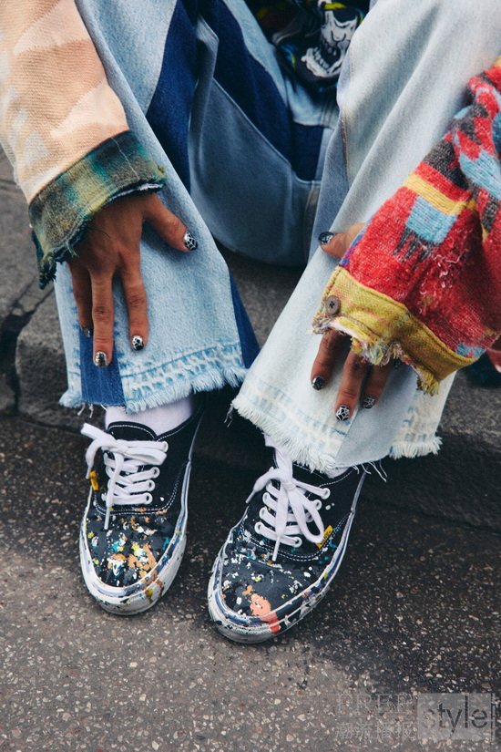 在此次联名设计中,创作痕迹成为贯穿全程的主题:鞋头饰有自然滴落的颜料痕迹,鞋面呈现层层叠叠的泼洒效果,大底包边则点缀自然的油渍印记,共同构筑出丰富而细腻的视觉层次。鞋腰与后跟保留大片留白,宛如画布,衬托出鞋侧环绕印制的红色 “ART THAT KILLS”,正是对艺术表达无畏不羁精神的宣言。细节处,鞋面缝线处点缀 Gallery Dept.的黄色织标,鞋垫则印有双方联名专属标识,并搭载 Vans 经典华夫外底,于细微处延续品牌的质感与匠心。