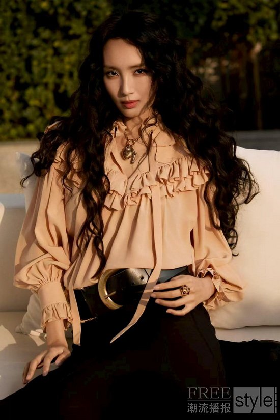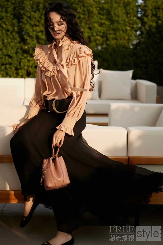 中国女演员王紫璇身着丝质提花荷叶边廓形衬衫上衣和黑色丝绸薄纱超长半身裙,出席于海南三亚举办的2025海南岛国际电影节《我是全世界最幸福的宝贝》映后礼。