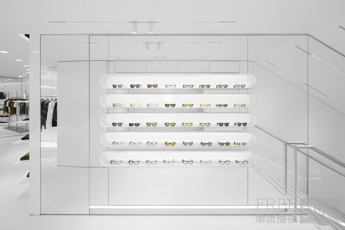 BAPE STORE® 1881 HERITAGE专门店以突破性的沉浸感设计,重新定义高端街头服饰的零售体验空间。店铺外部以弧形LED屏幕为视觉焦点,呈现灵感源自香港标志性霓虹灯的定制动画。店内陈列着醒目的鲨星人玻璃钢雕塑,其仿石质感意在致敬BAPE®的街头文化根源。室内空间首次采用全白色的极简风格,与BAPE®签名式的大胆图案形成强烈的视觉碰撞;搭载LINE CAMO的LED天花板通过变幻色彩营造流动氛围。此外,嵌有LINE CAMO纹理的玻璃隔断在拓展空间纵深感之余,更突显了独特的现代气息。