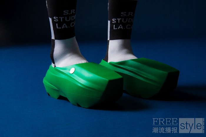 在对经典 Vans 鞋型进行当代转译之外,本次联名系列还带来了全新绿色的 FUTURE CLOG 鞋款。该鞋型将有机、极简的套脚式鞋履形态与雕塑感十足的荷兰木屐造型相融合,打造造型张力的全新轮廓。FUTURE CLOG 采用可拆分、可套合的双层结构设计:内层鞋履可独立穿着,亦可嵌入外层鞋套之中使用,使穿着方式在不同场景之间灵活切换。系列亦推出红黑撞色提花袜,以鲜明的色块对比为整体造型补充层次,在细节处延续联名系列的视觉张力。