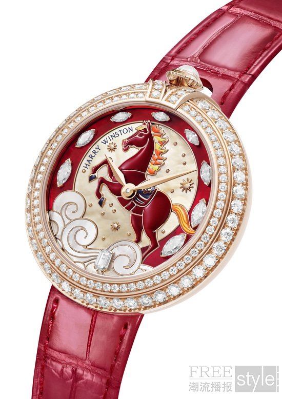 为庆祝中国马年,海瑞温斯顿Moments系列推出一款奢华玫瑰金腕表。表盘上的骏马采用鲜艳的红色漆面,栩栩如生,彰显出中国十二生肖中第七位生肖所象征的独立、力量和冒险精神。作品还致敬了深远的中国文化传统,缀以海瑞温斯顿至美的璀璨钻石,尽显非凡魅力。这款马年主题腕表限量发行8枚,寓意吉祥美满。