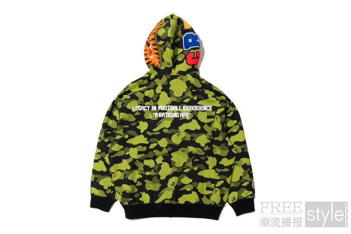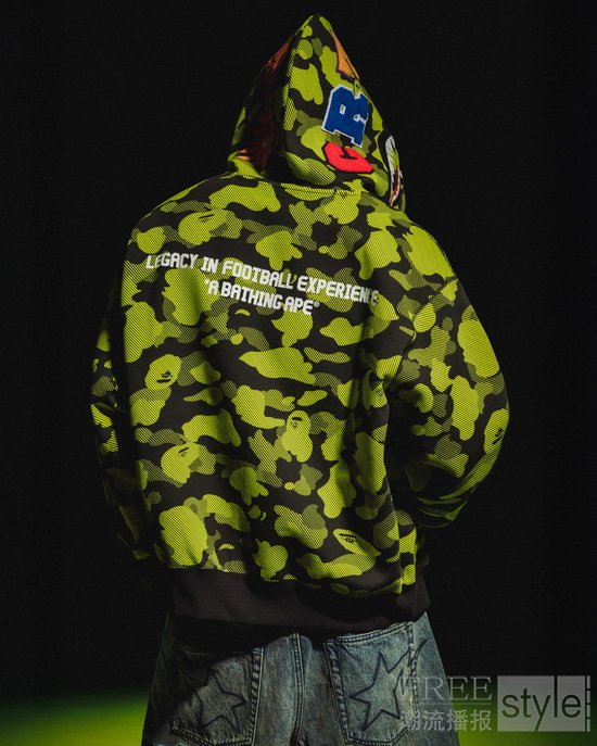 作为系列的核心单品,REFLECTION CAMO鲨鱼帽衫大胆重塑BAPE®标志性迷彩图案。这款迷彩象征着运动与能量,以CR7® LIFE 品牌标识为灵感,采用极具动态冲击力的草绿色呈现,诠释街头时尚与足球文化的完美融合,无疑是令球迷与收藏家皆为之倾心的焦点之作。