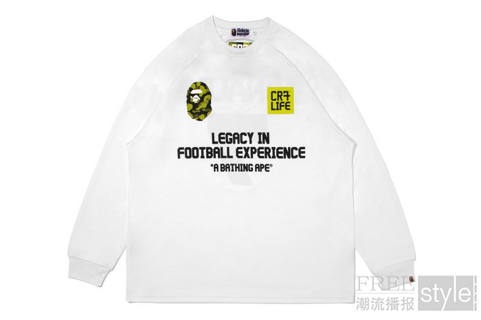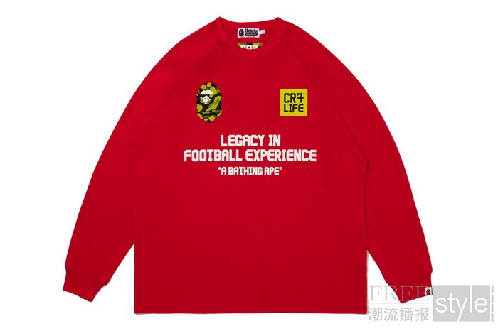 与鲨鱼帽衫搭配的,是为忠实球迷量身打造的长袖球衣,提供白、黑、红三款配色。衣身正面搭载APE HEAD徽标与CR7® LIFE标志,背面则以醒目的「RONALDO 7」球衣编号致敬足坛传奇。系列亦为真正的品牌爱好者设计隐藏彩蛋——CR7® LIFE标识暗藏衣标之下,低调彰显官方权威与专属价值。此次联名再次突破边界,以独特的设计语言连结时尚与足球两大文化社群,为跨界合作赋予无限可能。