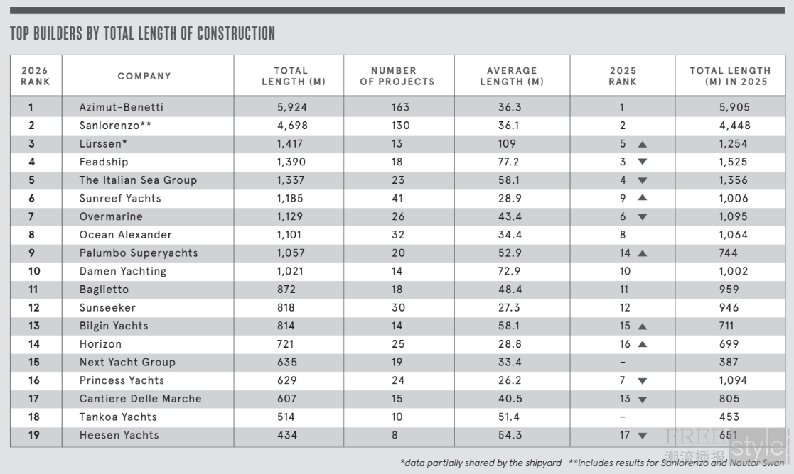 这一成绩进一步巩固了集团作为全球领导者与意大利卓越品质代表的地位,彰显意大利在国际高端游艇领域的核心角色。集团在所有评估类别中均保持领先:在建游艇163艘,总长5924米,占报告所统计全球市场份额的23%。