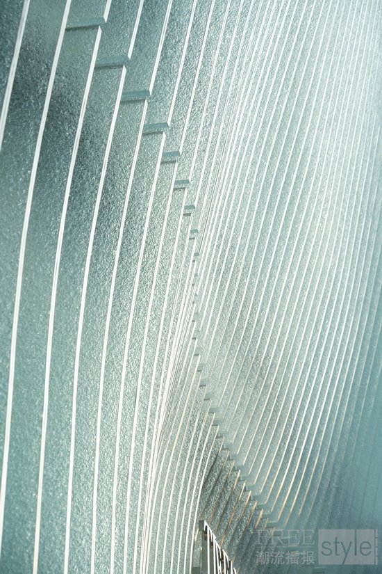 旗舰店外立面由MVRDV建筑事务所设计,灵感源自品牌传奇设计师艾尔莎·柏瑞蒂(Elsa Peretti)经典作品的优雅之美。外立面采用经环保回收并于本地制造的鳍片式玻璃构筑,将诗意律动与几何美感融于一体,并在光影流转间呈现出波浪般的视觉效果与层次渐变的蓝色光泽。这一外立面将蒂芙尼玻璃工艺传承与建筑语言、光影艺术相融合,是品牌隽永特质的当代演绎。