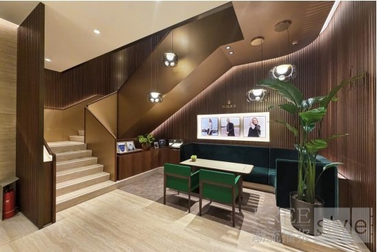 作为劳力士店铺中少见的双层精品店,新店在空间布局上巧妙构建了一条“从历史底蕴通往生活方式”的探索动线。一层大厅设有国内目前面积最大的劳力士标志性绿墙,天然纹理与极致精美的拼接工艺,是品牌严谨制表精神的空间化表达。与之相对应的另一面展示墙将劳力士的精密机械美学与艺术想象力完美展现。值得一提的是,这面展示墙的保养工艺要求极高,其存在本身,即是对店内极致服务标准与维护能力的自信体现。