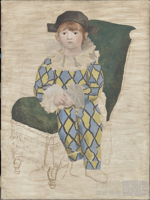 儿童主题作品,如《装扮成喜剧丑角的保罗》(1924)与《与玩具卡车玩耍的孩子》(1953),则呈现了毕加索创作中柔和而富于象征的一面。毕加索一直将童年视为其创作中的核心,儿童在他的创作中既是描绘对象,也是引发形式革新的重要源泉。他借由儿童视角的天真与自由,从中提取新的线条与形体方式,寻求摆脱传统绘画规范的可能,“像孩子一样画画”成为贯穿他艺术生涯的内在愿望。