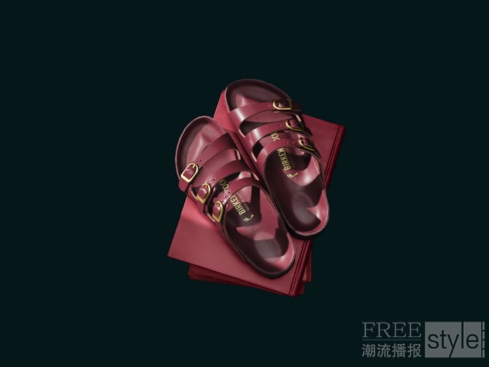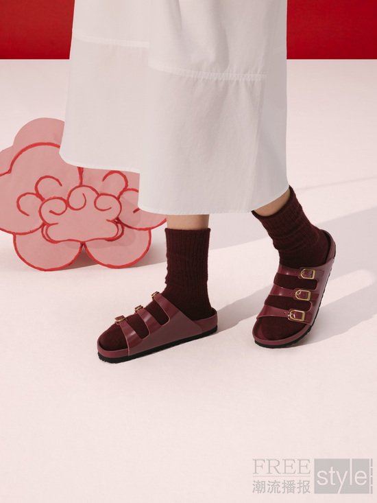 BIRKENSTOCK 马年新春系列的开篇之作为全皮包覆版本的 FLORIDA 三带凉鞋,搭载 BIRKENSTOCK 经典软木乳胶鞋床。鞋面以高光皮革打造,并饰以三枚金色 D 型扣,尽显奢华精致之感。深邃浓郁的酒红配色呼应新春,在中国文化中也寓意吉祥与繁荣。