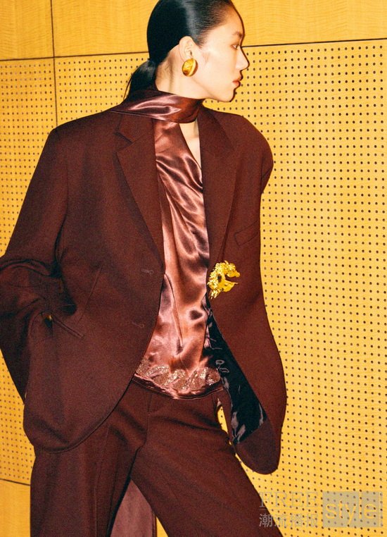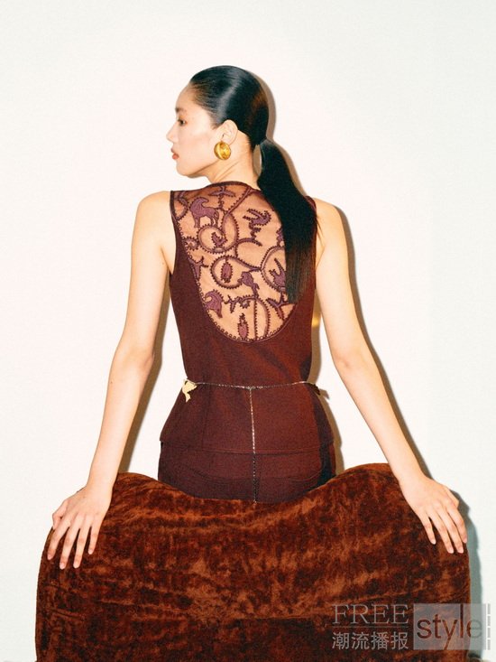 系列重塑经典版型,涵盖挂脖短上衣、吊带长裙、开叉流苏半裙、套头毛衣、衬衫、长裤及西装套装等多元单品,以JACQUES WEI擅长的动物印花为引,辅以钉珠、流苏及金属饰品,与柔软织物形成视觉对比,以丰富材质与纹理层次谱写野性张弛与奢华优雅碰撞交织的感官叙事。采用光泽感面料的挂脖短上衣与长裙以轻盈系带修饰颈肩曲线,领口点缀“骏马”金属扣饰,塑造时髦姿态;半裙以流苏结构营造马鬃流动飘逸的视觉效果,演绎从容自如的野性力量。短款夹克借流畅廓形铺展马纹印花,粗粝质感与挺阔剪裁为单品赋予新生。金属扣西装外套则以明晰轮廓与流畅线条为基调,点缀立体马头金属扣饰,于细节中提升整体质感,呈现当代型格。