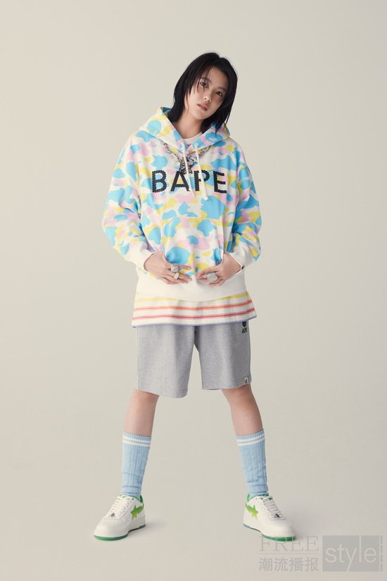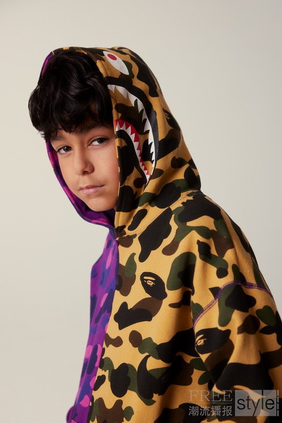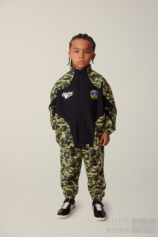 GLITCH WOODLAND CAMO单品成为系列焦点,以柔软棉质针织与抓绒面料保障全天候舒适穿着。背心、卫衣与长裤等复古单品散发怀旧气息;SPLIT CAMO迷彩则由COLOR CAMO与1ST CAMO创意拼接而成,大胆呈现于鲨鱼印花长裤之上。数码印花单品独具巧思,包括拼布衬衫、缀满徽章和布章的学院风棒球夹克,为孩子们打造充满趣味性且富有表达力的个性造型,完美传承BAPE®原生街头基因。