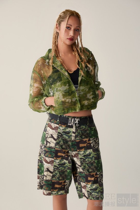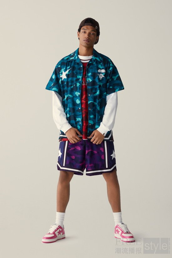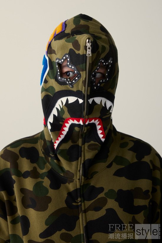 亮点单品囊括混色纱线针织条纹上衣,以及搭载醒目荧光黄的LINE CAMO迷彩套装。配饰阵容以绿色和粉色ABC CAMO保龄球包升华主题,搭配提花毛巾布帽衫、背心及短裤,完美适配夏日的层次感叠搭造型。系列压轴之作,标志性鲨鱼连帽衫迎来大胆重塑,连帽眼部玩味融入BAPE STA™星形镂空设计,皮革与水钻镶边尽显奢华锋芒。